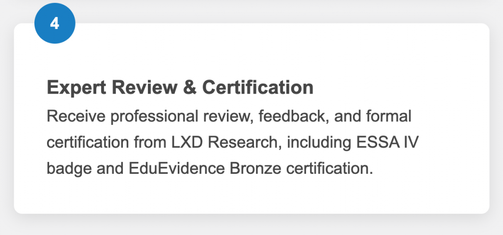 The Fast-Track ESSA IV solution provides you with expert guidance to develop your own Logic Model and ESSA Tier 4 documentation, followed by professional validation from LXD Research, allowing you to achieve significant cost savings while still meeting ESSA requirements.